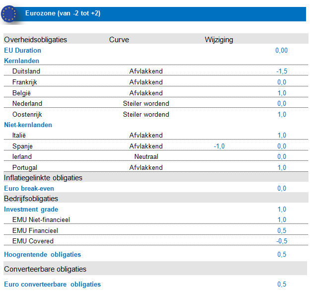 Zoals verwacht nam de ECB geen enkele monetaire beslissing tijdens haar bijeenkomst in september. De beperkte opwaarts herzien groei- en inflatiecijfers werden in beperkte mate als ‘hawkish’ beschouwd. De rentevoeten op de obligaties uit de kernlanden zijn nog steeds extreem laag, hoewel we op korte termijn absoluut geen rentestijging hoeven te verwachten.De rentes op overheidsobligaties uit de kernlanden zijn nog steeds bijzonder laag, hoewel het duidelijk is dat we op middellange termijn geen rentestijging hoeven te verwachten. De rentevoeten buiten de kernlanden kunnen op ons enthousiasme rekenen. We staan dan ook eerder positief tegenover Portugese en Italiaanse rentevoeten ten opzichte van Duitse rentevoeten. De perifere overheidsobligaties hebben in mei beter gepresteerd dan overheidsobligaties uit de kernlanden. Ook het Europees Herstelfonds biedt soelaas. We zien dat het immers aanzienlijke middelen uittrekt voor de perifere landen. Qua landen hebben we ook de posities in Luxemburg uitgebreid via een groene primaire emissie. Tegelijkertijd zijn we ook voorzichtiger geworden voor Ierland, gelet op de moeizame onderhandelingen tussen de EU en het VK. Door de band genomen wordt onze negatieve kijk op de rentevoeten van de kernlanden gecompenseerd door onze positieve mening over de rentevoeten van de niet-kernlanden, en onze positie in de EUR. De duration is momenteel neutraal.