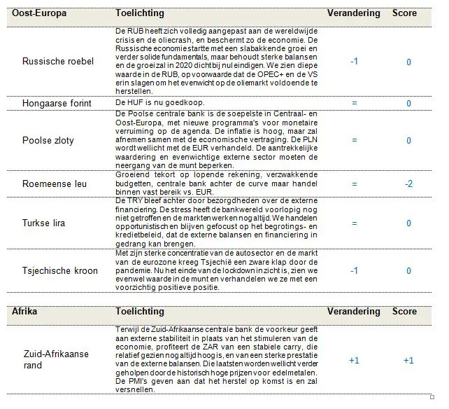 We updateten onze top-downbeoordeling van de wereldwijde markt en de brede activaklasse. Daarbij erkenden we de gunstige financiële omstandigheden, met wereldwijd meer dan voldoende liquiditeit, ondersteunende beleidsmaatregelen door de centrale banken in de industrielanden en een constructieve visie op grondstoffen, zoals olie, industriële en edelmetalen en landbouwproducten. We merkten ook dat het economische herstel in China en de groeilanden zich wijder verspreidde, en de stromen naar de activaklasse verder stabiliseerden. Terwijl we onze score voor de financiële omstandigheden niet wijzigden, verhoogden we onze score voor de fundamentals van de groeilanden een beetje vanwege de sterkere groei en de resultaten van de externe sector. De economische statistieken uit de groeilanden begonnen positief te verrassen, wat overeenstemt met onze visie dat wellicht positieve verrassingen zouden volgen op de negatieve verrassingen van eerder dit jaar. We verhoogden onze score voor de balansen van de externe sectoren in de groeilanden, want we vonden indrukwekkend bewijs van positieve tendensen in de lopende rekeningen en handelsbalansen en van een verbetering van de liquiditeit in alle groeilanden. Eerdere bezorgdheden over de houdbaarheid van de schulden van de groeilanden zijn ook deels opgelost, omdat de primaire markten dit jaar tot nu toe een brutoaanbod van bijna $ 179 mld. hebben opgenomen, waarbij nog maar $ 45 mld. bruto ($ 10 mld. netto) overblijft om tegen eind dit jaar te financieren. De stromen naar de groeilanden bleven in september positief (de instroom van $ 5,4 mld. in groeilandobligaties in harde munt in september bracht het totaal sinds begin dit jaar op $ -10,1 mld.), waardoor het risico van een uitstroom uit de activaklasse voor het volledige jaar iets verkleinde. De uitstroom van dit jaar concentreerde zich bij de groeilandobligaties in lokale munten, terwijl de schulden in harde munten $ 19,3 mld. hebben teruggewonnen sinds eind april 2020. Ondanks de gunstige stroomdynamiek tot september waren de technische factoren van harde munten neutraal, omdat de positionering in staatsobligaties in harde munten oncomfortabel groot was en het brutoaanbod in de herfst waarschijnlijk weer zal opstarten in overeenstemming met de seizoenstrends. De waarderingen van harde munten waren minder aantrekkelijk op absolute basis maar blijven op middellange termijn aantrekkelijk in vergelijking met kredieten uit de geïndustrialiseerde landen.