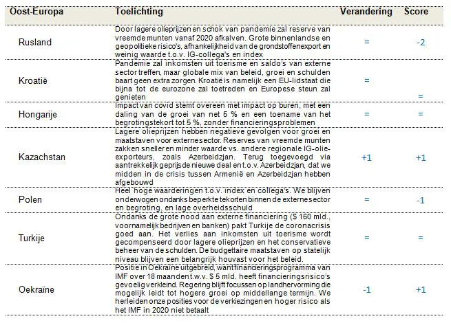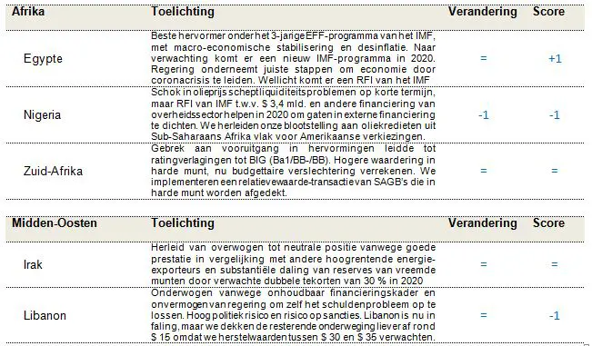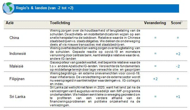 We blijven constructief over het pad van de olieprijzen op middellange termijn. De olieprijzen zijn wellicht uitgebodemd doordat de omstandigheden van de vraag en het aanbod enigszins verbeterden sinds mei 2020. Een deel van het overtollige olieaanbod wordt naar verwachting weggewerkt dankzij de productieverlaging met 9,7 mln. vaten/dag die de OPEC in april had aangekondigd, de bijkomende tijdelijke verlaging van 1,2 mln. vaten/dag door Saudi-Arabië eind mei en de gedwongen stillegging van een schalieoliecapaciteit van zo’n 2 mln. vaten/dag in de VS. Tegelijk zal de versoepeling van de wereldwijde lockdowns de vraag naar olie vermoedelijk een beetje doen stijgen. Hoewel we niet verwachten dat het onevenwicht in vraag en aanbod op de oliemarkt voor midden 2021 wordt weggewerkt, of dat de olieprijzen weer ver boven $ 40 zullen klimmen, beschouwen we de stabilisering van de olieprijs als een gunstige ontwikkeling voor groeilandobligaties in harde munten. Gezien de grote onzekerheid op korte termijn behouden we liever een blootstelling aan olie via emittenten met een hogere rating, zoals Kazachstan, Qatar en de VAE, en herleiden we tegelijk onze blootstelling aan emittenten met een lagere rating, zoals Angola, Ecuador, Nigeria en Pemex (Mexico).