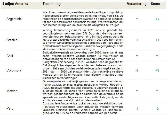 In Europa blijft de dreiging van covid-19 toenemen terwijl een tweede golf zich verder over de regio verspreidt. In landen zoals België, Frankrijk en Spanje piekt het aantal besmettingen, waardoor verscherpte maatregelen en gedeeltelijke lockdowns worden doorgevoerd. Verschillende landen kondigen de komende weken wellicht nieuwe beperkingen aan, wat het reeds trage en fragiele economische herstel nog meer onder druk zet. Wat de inflatie betreft zijn de totale inflatie en de onderliggende inflatiemaatstaven de voorbije maanden aanzienlijk verzwakt. Daardoor liggen de inflatieverwachtingen nu lager en worden de inflatievooruitzichten van de ECB in vraag gesteld. Hoewel de slagkracht van de ECB (in de vorm van activa-aankoopprogramma’s en het uitgebreide PEPP) de rentes voor de kern- en perifere landen laag heeft gehouden, verwachten de markten meer acties van de ECB om de algemene vertraging van de inflatie tegen te gaan. Naar verwachting kondigt de centrale bank in december een verdere verhoging en verlenging van het PEPP aan om de gevolgen van de tweede uitbraak van het coronavirus en de zwakke inflatiedynamiek te beteugelen. De rentes van de kernlanden zijn nog altijd extreem laag, maar het is duidelijk dat ze op korte termijn niet zullen stijgen. Het feit dat de aankopen van Franse obligaties binnen het PEPP onder de kapitaalverdeelsleutel liggen, kan de komende maanden echter veranderen, wat gunstig is voor de Franse spreads. De rentes van de periferie worden ook nog altijd geholpen door het monetaire beleid van de ECB en de grotere Europese solidariteit. Hoewel de economische risico's aanzienlijk blijven, is de uitkomst van het Europese herstelfonds met omvangrijke subsidies duidelijk gunstig voor de niet-kernlanden. Het aanbod blijft gunstig voor de rest van 2020. De positionering is echter nog altijd een negatieve factor, want de longpositionering blijft groot in niet-kernlanden, zij het minder extreem dan in het verleden. Het risico van politieke gebeurtenissen in Italië is verder weggetrokken, doordat de lokale verkiezingen in zes belangrijke Italiaanse regio’s een onverwacht positief resultaat opleverden van 3-3 voor de regerende centrumlinkse partij PD vs. de centrumrechtse oppositie. In dat klimaat houden we vast aan onze positieve visie ten aanzien van Italië en Portugal. Na de indrukwekkende run op de niet-kernlanden hebben we onze blootstelling een beetje afgebouwd door weer neutraal te worden ten aanzien van Spanje. Relatief gezien, zijn de waarderingen minder aantrekkelijk, terwijl de Spaanse economie heel kwetsbaar kan worden door een verdere stijging van het aantal covid-19-gevallen. De goedkeuring van de begroting voor 2021 zal ook een uitdaging worden, gezien Spanjes minderheidsregering. Het blijft onzeker hoe de onderhandelingen tussen de EU en het VK op korte termijn zullen aflopen. Ons basisscenario blijft een deal tegen eind dit jaar, maar de kans dat een overeenkomst wordt gesloten, wordt mogelijk kleiner in de nabije toekomst, wat de markt tijdelijk zorgen baart. We verkiezen daarom om onze posities in de brexitgevoelige Ierse staatsobligaties tactisch terug te schroeven, aangezien Ierland sinds maart relatief goed heeft gepresteerd in vergelijking met de kernlanden.