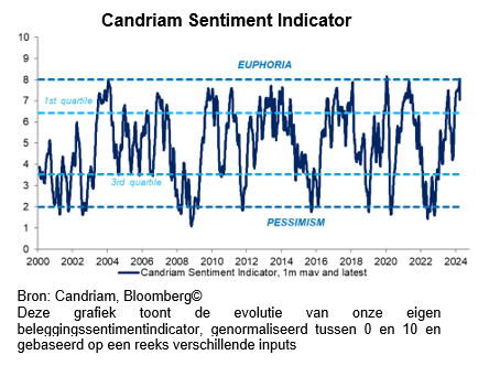 Onze samengestelde sentimentsindicator, gebaseerd op een uitgebreide reeks marktfactoren, technische gegevens en enquêtes onder beleggers, heeft halverwege maart het "euforische" niveau bereikt, wat een tegendraads verkoopsignaal voor Amerikaanse aandelen veroorzaakte. Na de sterke prestaties van de afgelopen twee kwartalen zullen we waarschijnlijk een consolidatiefase zien aan het begin van het tweede kwartaal.