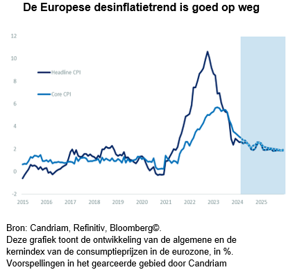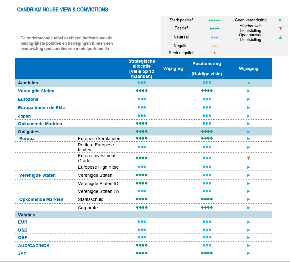 Volgens ons is het tijd om de portefeuille meer cyclisch te maken om in te spelen op een verbeterend beursklimaat. Terwijl de desinflatietrends in Europa aanhouden, zijn de economische verrassingen in de regio positief, wat leidt tot een beter sentiment en geldstromen. We merken op dat de belangstelling van beleggers enigszins terugkeert, nu de risicopremie over het algemeen aantrekkelijk is. Achterblijvers zouden sterker kunnen presteren in een context van economische verbetering en dus een inhaalbeweging maken. We zijn daarom neutraal geworden voor aandelen uit de EMU, vanuit een cyclisch standpunt, en voegen Small- en Mid-caps toe aan de portefeuille. Bovendien werden we, naast de dataflow, gerustgesteld door de recente vergaderingen van de centrale banken en denken we dat de verwachte aanstaande renteverlagingen een bijkomend ondersteunend element zijn dat zou moeten werken als steun en tegelijkertijd de obligatierentes op lange termijn zou moeten afremmen, wat onze positieve visie op duratie ondersteunt. We hebben onze blootstelling aan Europese Investment Grade bedrijfsobligaties verlaagd van overwogen naar neutraal, en blijven profiteren van een carry via schuldpapier van opkomende markten.