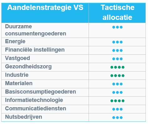 We hebben onze allocatie ongewijzigd gelaten en blijven overwogen in Industrie, Technologie en Gezondheidszorg. Zowel Technologie als Gezondheidszorg blijven gesteund door een solide winstmomentum, sterke fundamentals en aantrekkelijke groeifactoren voor de lange termijn. De industrie profiteert van de reshoring-inspanningen van bedrijven en de verwachtingen voor een versnelling van de Amerikaanse productieactiviteit.