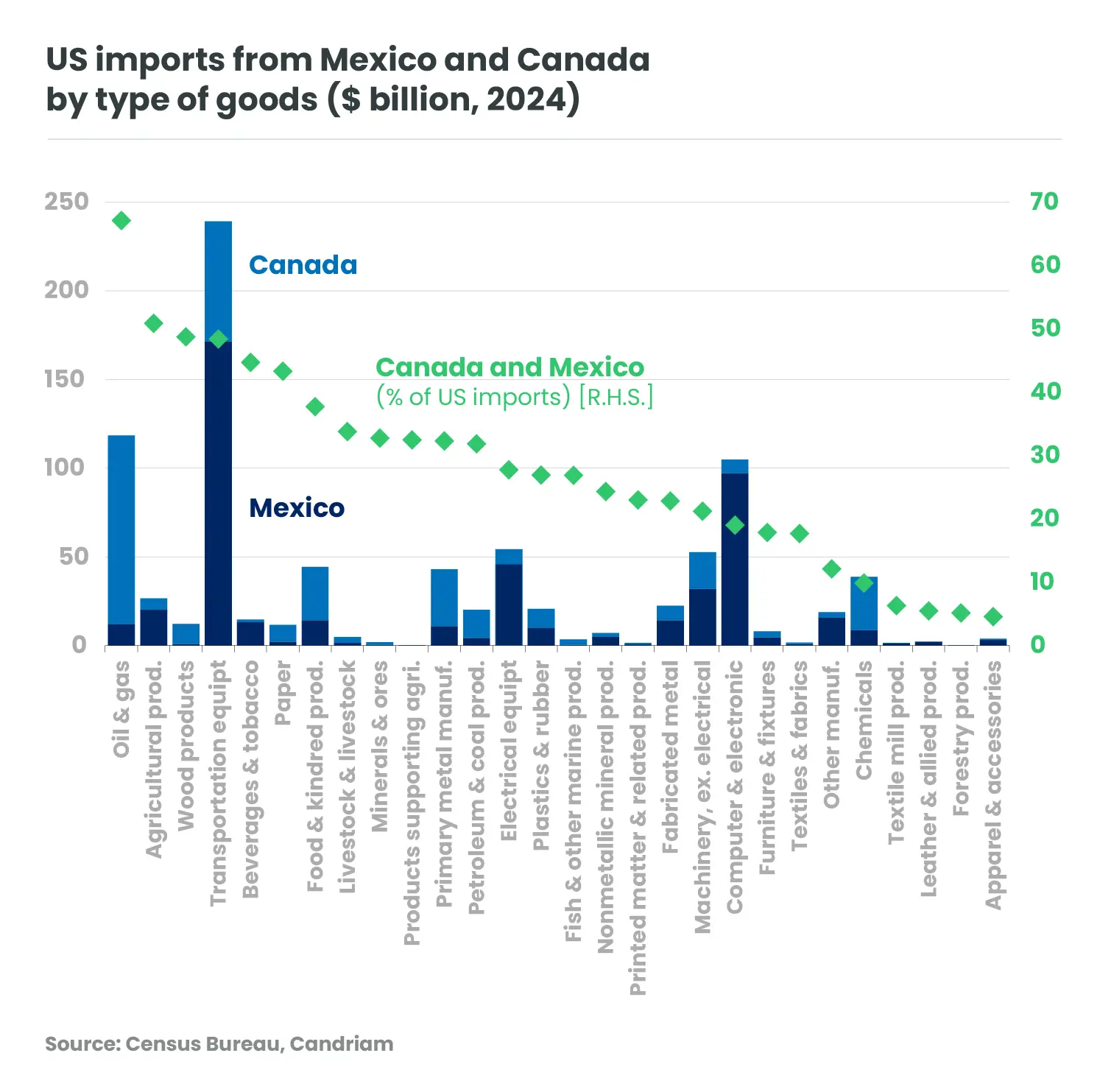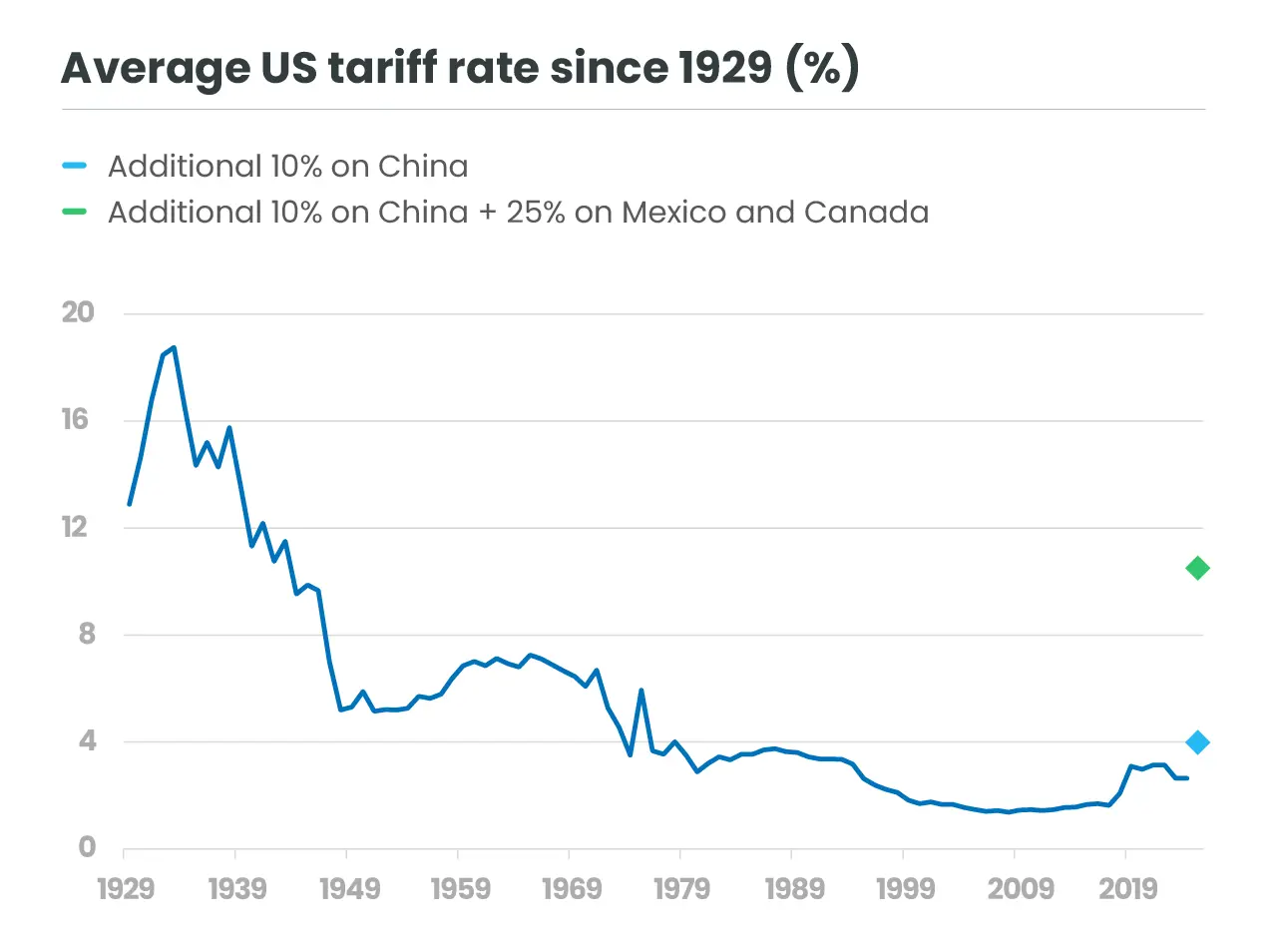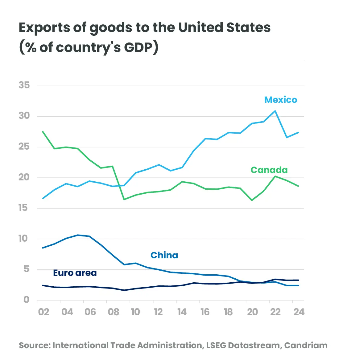 Een paar dagen nadat hij Mexico en Canada in 2025 had bedreigd, verleende de president een maand uitstel van de toepassing van tarieven op deze twee landen, in ruil voor concessies om de grensbeveiliging te versterken. Trump besloot echter op de tarieven voor China met 10% te verhogen, een veel bescheidener verhoging dan de 60% die tijdens de verkiezingscampagne werd genoemd. In perspectief blijft deze stijging voorlopig relatief beperkt (het gemiddelde tarief op producten die door de Verenigde Staten worden geïmporteerd, stijgt van 2,5% naar 4%) en de gevolgen voor de inflatie en de groei in de VS zouden laag moeten zijn.