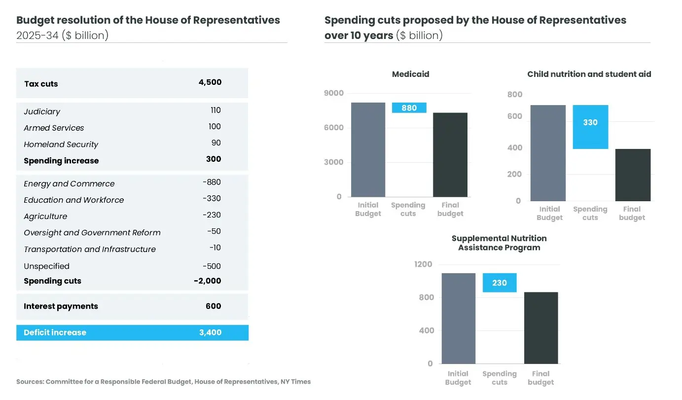 Het Amerikaanse begrotingsproces is complex en de komende weken zullen verschillende kwesties centraal staan. Om een shutdown van de overheid te voorkomen, moet het Congres een begroting goedkeuren voor het fiscale jaar 2025 (dat begon in oktober 2024), of op zijn minst instemmen met een stemming over een nieuwe "voortdurende resolutie" (de resolutie die in december vorig jaar werd aangenomen, loopt af op 14 maart 2025). Om te voorkomen dat de Amerikaanse overheid technisch in gebreke blijft, moet ook het schuldenplafond worden verhoogd.