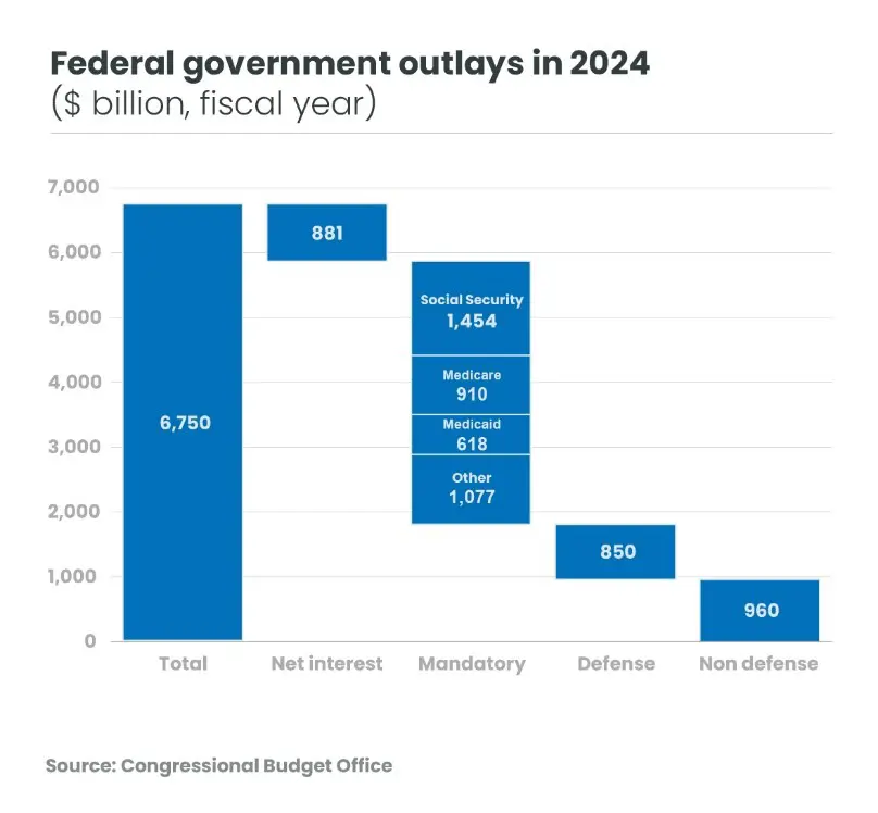 Gezien de structuur van de federale uitgaven lijkt de belofte van Elon Musk onrealistisch: De overheid moet rente betalen over haar schuld (bijna $ 900 dollar) en de president heeft aangekondigd dat hij niet zal raken aan de zociale zekerheid ($ 1,5 biljoen) of Medicare ($ 910 miljard). Bezuinigen op defensie-uitgaven ($ 850 miljard) zouden ook niet populair zijn bij de Republikeinse kiezers. Dan blijft er nog $ 960 miljard over voor discretionaire uitgaven en $ 1,6 biljoen voor verschillende sociale programma's (zoals Medicaid, voedselbonnen en kindervoedingsprogramma's). Deze uitgaven met meer dan de helft verminderen in één jaar is een hele opgave!