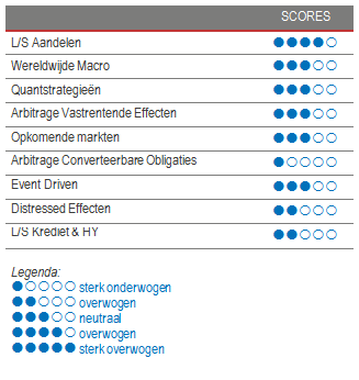 November was een sterke maand voor de meeste Long Short Aandelenstrategieën. Dankzij de goede gang van zaken op de aandelenmarkten konden de beheerders goede cijfers voorleggen. Volgens Prime Brokerage data genereren beheerders echter alfa op zowel hun long- als shortportefeuilles. Dit jaar wordt een van de beste jaren op het vlak van alfa sinds 2014. Anderzijds hebben Marktneutrale Long Short Aandelenstrategieën het moeilijk om hun portefeuilles aan te passen aan sterk stijgende markten, en aan sector- en stijlrotaties. Het huidige klimaat is niet gemakkelijk als gevolg van economische onzekerheid en een snel wisselend sentiment. Sterke anomalieën creëren echter steeds kansen voor zowel long als short beleggingen. Amerikaanse aandelen in de gezondheidssector zijn hiervan een goed voorbeeld. Het zou een vergissing zijn om de hele sector links te laten liggen omwille van de door politiek ingegeven volatiliteit. Goede beheerders zullen van de huidige situatie gebruik maken om een evenwichtige portefeuille van long en short beleggingskansen op te bouwen. Deze strategie biedt een ruime waaier aan hefbomen die kunnen worden gebruikt om in te spelen op herstructureringen in de industrie en sectordisperie vanuit long of short perspectief.