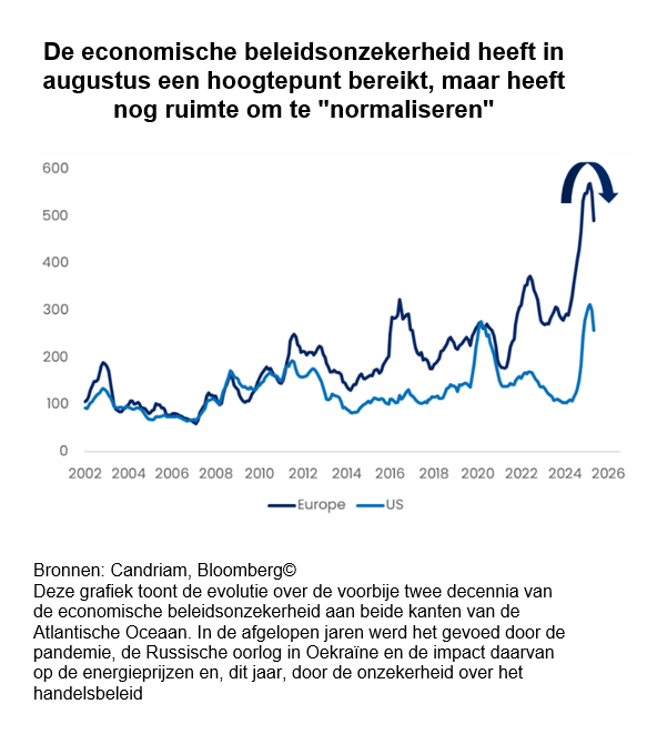 De onzekerheid bereikte in augustus een piek maar is sindsdien afgenomen. Het beleidsrisico is verminderd, de financiële voorwaarden zijn verbeterd en zelfs geopolitieke krantenkoppen zorgen nog maar zelden voor schokeffecten. Een jaar na een presidentsverkiezing die turbulentie voorspelde, oogt de macro-omgeving stabieler dan verwacht. Voor de markten is dat van belang: de balans tussen voorzichtigheid en kansen verschuift richting meer risicobereidheid.