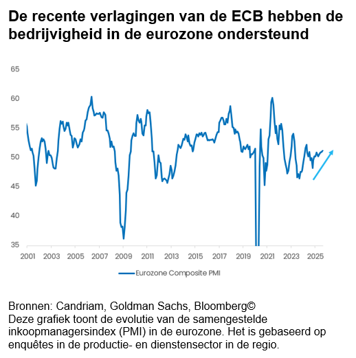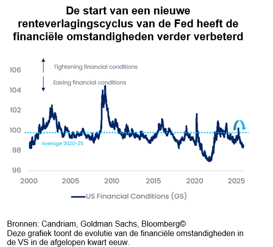 Tot dusver heeft de hernieuwde monetaire versoepeling opnieuw flexibiliteit in het systeem gebracht. De Amerikaanse financiële condities zijn nu ruimer dan hun langetermijngemiddelde, dankzij de renteverlagingen van oktober en stabiele kredietmarkten. De liquiditeit is overvloedig, de volatiliteit laag, en de obligatiemarkt is helder: de economie koelt langzaam af, maar krimpt niet.