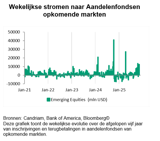 Opkomende markten zien opnieuw instroom na een lange periode van aarzeling. Kapitaal keert terug nu de dollar verzwakt en de risicobereidheid toeneemt. Sterkere lopende rekeningen en gedisciplineerd monetair beleid vormen een stevige basis. Azië loopt voorop, met Korea en India die opnieuw tractie krijgen, terwijl Latijns-Amerika blijft profiteren van hoge carry, betere begrotingsdiscipline en stabielere handelsstromen.