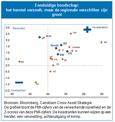 In deze erg onzekere toestand wordt de economische groei algemener verdeeld. Lage voorraden zouden de PMI's de komende maanden een duwtje in de rug moeten geven. Maar de groei is ook aan het afzwakken. We verwachten vanaf deze niveaus een matiger herstel richting het eindejaar en in 2021. Opmerkelijk is dat het tempo waarin de verschillende regio's herstellen, sterk uiteenlopend is.