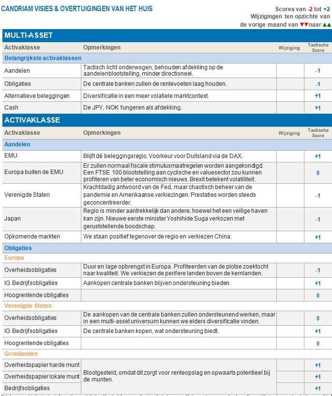 Het ziet ernaar uit dat de onzekerheid de komende weken een kookpunt zal bereiken. We denken dat de financiële markten moeilijk een uitgesproken richting zullen kunnen kiezen. We worden immers heen en weer geslingerd tussen erg fatalistische berichten over een tweede golf en de sterke hoop dat de Amerikaanse Food & Drug Administration (FDA) op korte termijn een vaccin zou kunnen goedkeuren in de verhitte setting van de presidentsverkiezingen. Onze assetallocatie blijft voorzichtig, met een onderwogen positie in aandelen en bescherming via opties. We erkennen dat bepaalde landen en sectoren in het huidige klimaat veerkrachtig zijn. De thema's die zullen profiteren van een opluchtingsrally wanneer er wordt aangekondigd dat er een goedgekeurd vaccin is, hebben op middellange termijn opwaarts potentieel. De landen hebben immers meer kennis vergaard over het virus, en verschillende farmabedrijven hebben een vaccin in de pijplijn zitten.