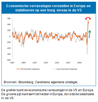 In deze bijzondere situatie blijven de economische cijfers gezond, vooral in de VS. Maar Europa beent bij, want het aantal economische verrassingen versnelt. Overal ter wereld blijven de PMI’s duidelijk de goede kant op gaan. In Europa getuigt de ZEW-index van hetzelfde vertrouwen in de economie. Ook China, waarvan de lager dan verwachte groei verrassend vertraagde, kan tegen eind dit jaar weer zijn niveau van voor de coronacrisis terugvinden.