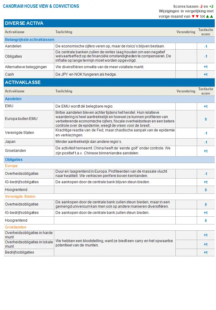 Om te profiteren van het goedlopende economische herstel, speelt onze blootstelling in op een structurele daling van de risicopremie voor de eurozone, namelijk long EMU en short Amerikaanse aandelen. We blijven ook neutraal ten aanzien van Britse aandelen, want hoewel ze misschien genieten van een betere controle over de epidemie, kan de brexit toch op hen wegen.