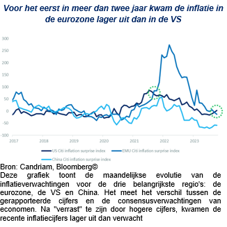 Europa blijft fundamenteel achter, met economische en inflatiecijfers die onder de verwachtingen blijven en negatieve verrassingen opleveren. Aan de start van het vierde kwartaal blijven niet alleen de groeiverwachtingen in de EMU duidelijk achter bij die van de VS en China; ook de inflatieverwachtingen zijn het afgelopen jaar omgeslagen en liggen nu onder het verrassingsniveau dat in de VS wordt gezien.