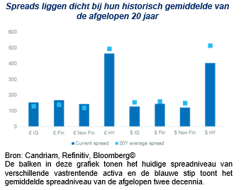 Door de verkrapping van de centrale banken is de rente op staatsobligaties gestegen naar niveaus die we in meerdere decennia niet hebben gezien. Tegelijkertijd bevinden de spreads van de meeste vastrentende beleggingen zich dicht bij hun langetermijngemiddelde. Hierdoor zijn de rendementen op het niveau van een gebalanceerde portefeuille hersteld, wat enige bescherming biedt tegen korte termijnvolatiliteit.
