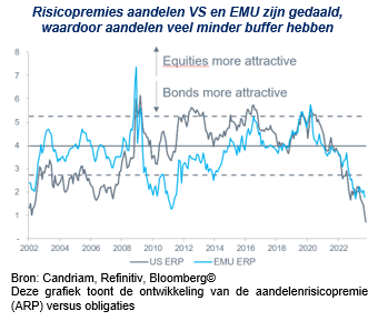 Specifiek gezien lijkt de risico-rendementsverhouding momenteel niet bijzonder aantrekkelijk, omdat de risicopremie voor aandelen niet voldoende is om beleggers aan te moedigen om hun investeringen te heroverwegen..