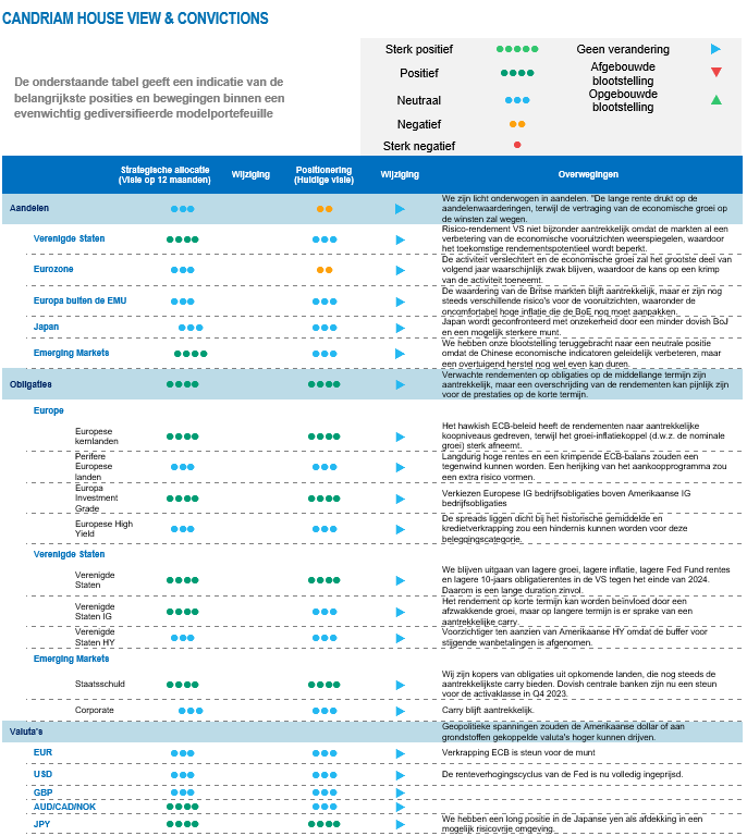 De groei blijft in twee snelheden voortbewegen. We hebben onze prognoses voor de economische activiteit in 2023 en 2024 opwaarts bijgesteld door de groei in de Verenigde Staten, waarbij ook de inflatie hoopgevende signalen vertoont. De druk op de lonen lijkt eindelijk te verminderen. Met deze ontwikkelingen in gedachten is de verwachting dat de Fed waarschijnlijk vasthoudt aan de “langer voor hoger”-benadering, zelfs zonder verdere renteverhogingen.