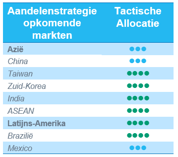 China: Neutraal. De macro-economische tegenwind houdt aan, waaronder de gekrompen inkoopmanagersindexen, de vastgoedcrisis, het lage consumentenvertrouwen en de geopolitieke druk. De overheid zal waarschijnlijk meer fiscale en monetaire steun geven, maar de groei zal waarschijnlijk onder het niveau van voor de pandemie blijven. De outperformance van China zal uiteindelijk meer tactisch zijn.