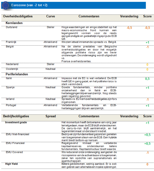 De niet-kernmarkten worden nog steeds ondersteund door de kwantitatieve versoepeling van de ECB. De dynamiek van de geldstromen in verband met nieuwe aankopen en herbeleggingen zou de niet-kernmarkten moeten ondersteunen. Hierdoor zullen de risicopremies dalen. Bovendien is het politieke risico dat de afgelopen maanden Italië onder druk zette geweken. Vervroegde verkiezingen werden immers tijdelijk vermeden nadat er een nieuwe regering werd gevormd in het land. In Spanje won de socialistische partij (PSOE) het hoogste aantal zetels, maar slaagt er nog steeds niet in om een meerderheid te vormen. Extreemrechts heeft ondertussen wel een sterke winst neergezet. We blijven de situatie opvolgen, aangezien er geen uitgesproken coalitie is om een regering te vormen. Bovendien lijken de niet-kernmarkten, vanuit activa-allocatie standpunt, het einde te naderen van hun meerjarige hoogtepunten. Daarom is voorzichtigheid geboden.