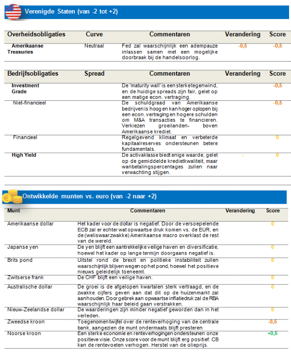 Ons intern ontwikkelde kader wijst nog steeds op een negatieve visie op de Amerikaanse dollar. De renteverlagingen van de Fed en het versoepelende beleid doen ook vermoeden dat de dollar zal verzwakken. We verwachten echter wel dat de centrale banken, na hun recente acties, een adempauze zullen inlassen. Aangezien de Fed al drie renteverlagingen heeft doorgevoerd en liquiditeit heeft geïnjecteerd in de markten, denken we dat de tijdelijke pauze in het versoepelende beleid waarschijnlijk zal leiden tot een stabiele dollar. In deze context geven we de voorkeur aan een neutrale positie op de dollar en blijven we de positie tactisch beheren.