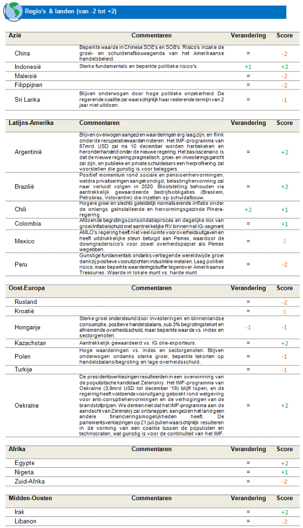 Groeilandenobligaties in harde munt zetten hun herstel door (0,3%). Dat is te danken aan de toenemende hoop dat de handelsoorlog tussen de VS en China zal ontspannen, en aan het constructieve risicosentiment (S&P 500 was 2,0% gestegen). De spreads op groeilandenobligaties namen met 9bp in (tot 328bp) en de 10-jarige Amerikaanse Treasuries waren stabiel rond 1,70%. Dat resulteert in positieve spread- en neutrale Treasury-rendementen. De binnenlandse politieke risico's van de groeilanden stegen fors door voorgestelde verlagingen voor energiesubsidies in Ecuador en prijsverhogingen van metrotickets in Chili. Hierdoor is het mogelijk dat de regering in beide landen valt. Een gepaste beleidsrespons kon de situatie stabiliseren, maar de overheid in beide landen diende de fiscale consolidatieplannen voor 2020 terug te schroeven. De Turkse invasie in het noordoosten van Syrië, nadat het Amerikaanse leger zich moest terugtrekken uit de regio, werd binnen de tien dagen opgelost nadat er op 18 oktober een staakt-het-vuren werd overeengekomen en de VS de sancties tegen Turkije ophief. Deze gebeurtenissen hadden geen verdere invloed op andere groeilanden. HY (+0,2%) en IG (0,3%) presteerden gelijkaardig, waarbij Tunesië (+3,0%) en Oekraïne (2,9%) de beste rendementen neerzetten, en Libanon (-14%) en Venezuela (-9,4%) de slechtste rendementen optekenden.
