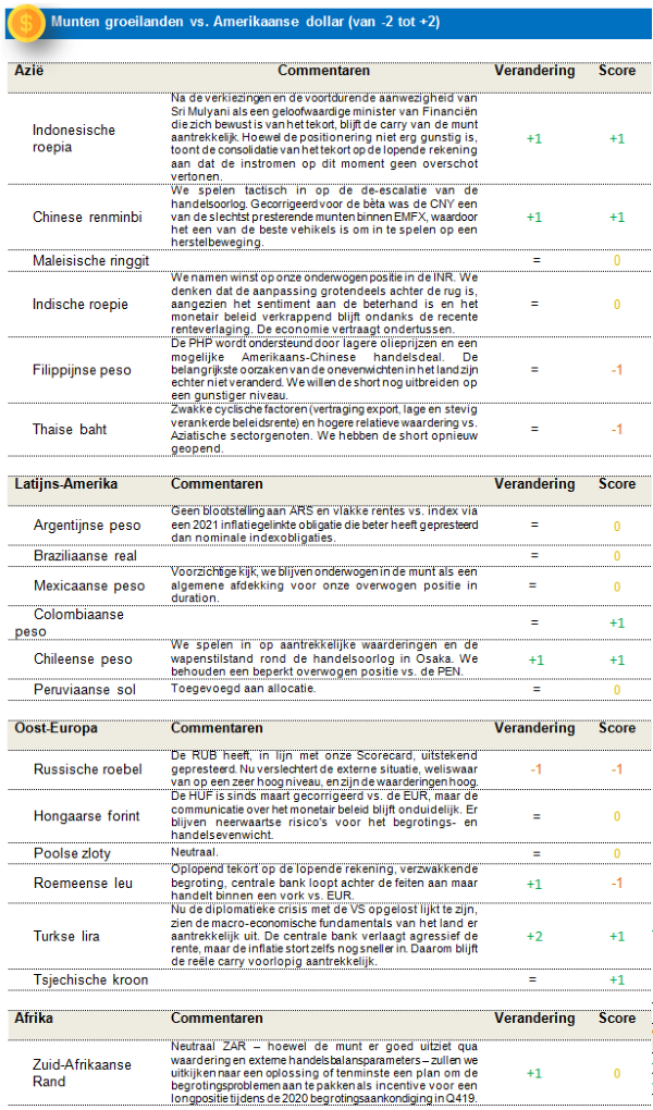 Ons basisscenario voor 2019 is een zwakke maar stabiliserende groei in de groeilanden en ontwikkelde landen, die duration verkiest boven EMFX. Binnen EMFX geven we de voorkeur aan de munten van landen die de groeivertraging aangegrepen hebben om de interne vraag te drukken en om hun handelsbalansen te verbeteren.