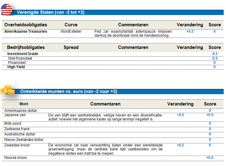 Ons interne kaderwerk geeft nog steeds een negatieve kijk op de Amerikaanse dollar. De renteverlagingen en het soepele beleid van de Fed wijzen ook op een zwakkere dollar. De Amerikaanse president heeft duidelijk gesteld dat hij een zwakkere dollar wil. We verwachten wel dat de centrale banken na de recente maatregelen een adempauze zullen inlassen. In een dergelijke context verkiezen we een neutrale positie op de dollar, en zullen we deze positie tactisch blijven beheren.
