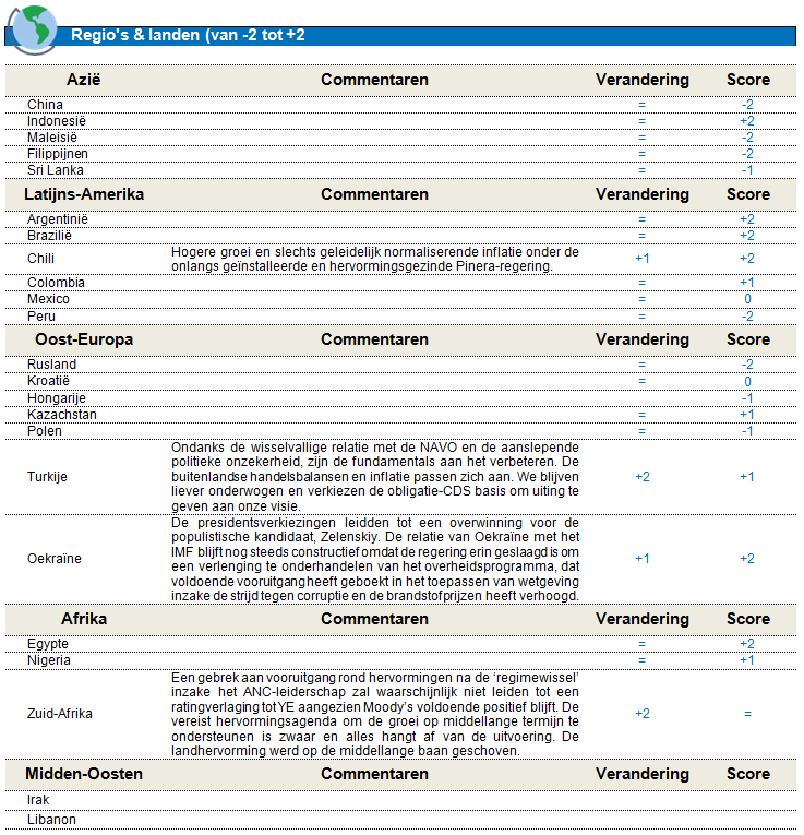 De nieuwe Argentijnse regering paste al snel een rist maatregelen toe om de crisis tegen te gaan, zoals belastingverhogingen, een meer conservatieve dan verwachte noodbelastingwet, een verlenging van de FX T-bill betalingen tot augustus 2020. Dit wijst allemaal op een versie van een meer pragmatisch dan verwacht, groeigericht peronistisch beleid. High Yield (3,6%) presteerde beter dan Investment Grade (0,7%), waarbij Argentinië (+21,6%) en Ecuador (15,3%) de beste rendementen neerzetten, en Suriname (-2,1%) en Tadzjikistan (-0,3%) de slechtste rendementen neerzetten.