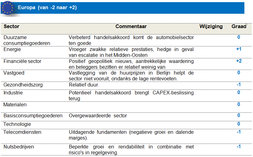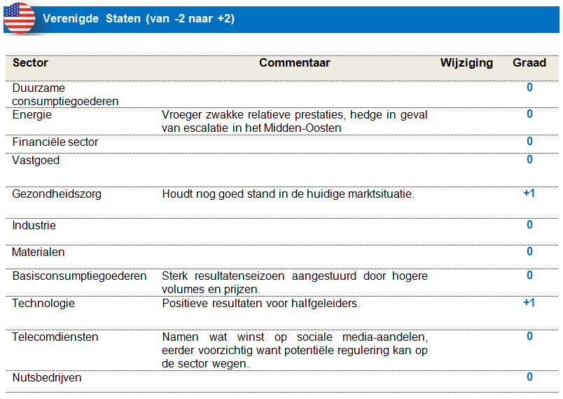 We zien energie nog steeds relatief zwak presteren, maar het Iraans conflict fungeert als een sterke katalysator voor de olieprijs. Enkele posities in deze sector zouden goed als hedge kunnen dienen in geval van escalatie in het Midden-Oosten. Zodoende hebben we onze onderweging tactisch verlaagd naar neutraal. We blijven onderwogen in de sectoren gezondheidszorg en technologie, aangezien die sterke resultaten blijven optekenen.