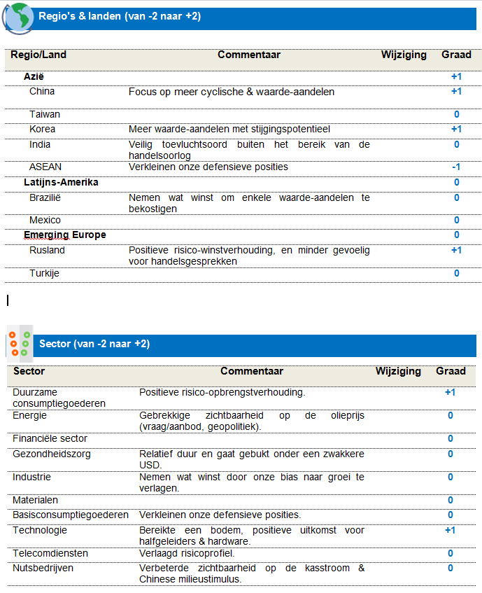 We houden vast aan onze neutrale posities in Brazilië en Taiwan met een licht positieve instelling tegenover waarde-aandelen. We blijven overwogen in China en hebben onze posities in ASEAN afgebouwd naar onderwogen. We blijven ook overwogen in IT (vooral voor hardware & halfgeleiders) terwijl we onze defensieve blootstelling via de sector basisconsumptiegoederen verlagen naar onderwogen.